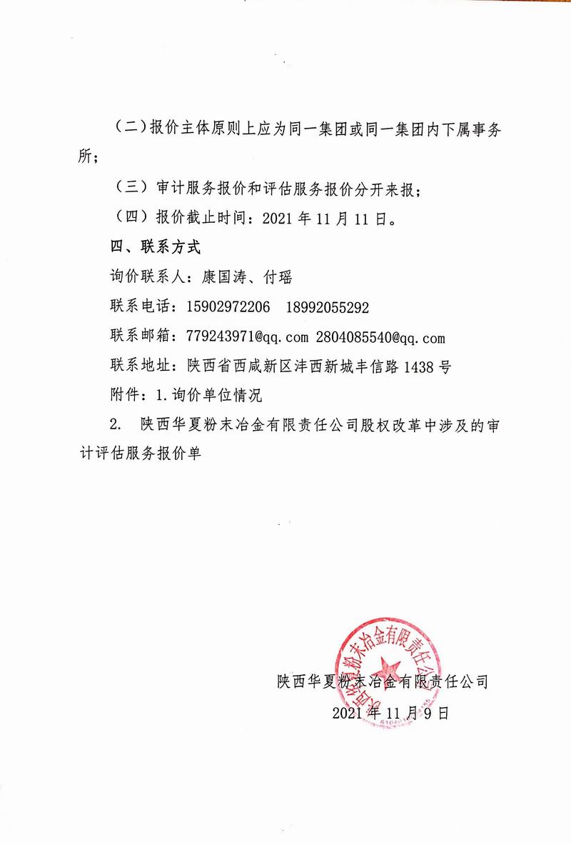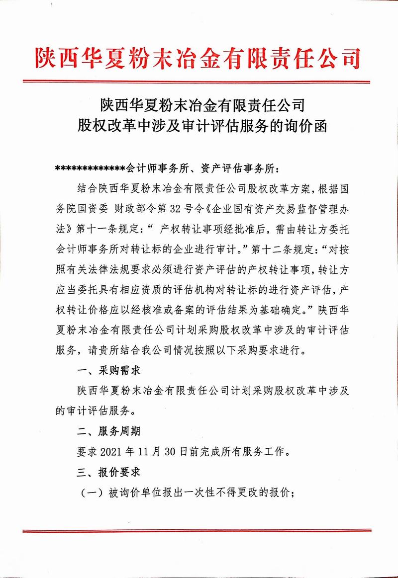 陜西華夏粉末冶金有限責(zé)任公司股權(quán)改革中涉及審計評估服務(wù)的詢價函
