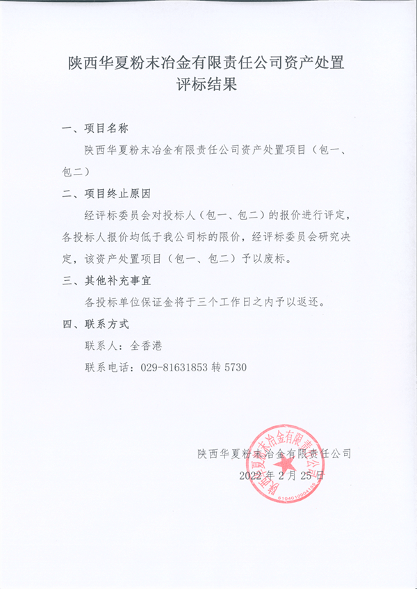 陜西華夏粉末冶金有限責(zé)任公司資產(chǎn)處置評(píng)標(biāo)結(jié)果